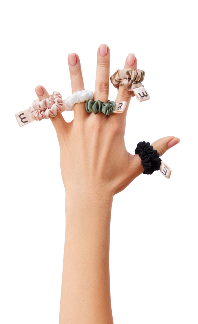 Зменшений формат резинок з натурального 100% шовку трендових кольорів втілює практичність та мінімалізм, бережно фіксує тонке волосся в 2 оберти, мінімізуючи його пошкодження та ламкість.