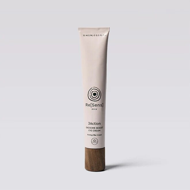 Re[Sens] 3 Action Exocome Boost Eye Cream - крем-філер навколо очей потрійної дії. Завдяки своїй унікальній формулі, розробленій з урахуванням потреб чутливої шкіри, крем ефективно бореться з ознаками старіння, зміцнює та освітлює шкіру навколо очей, надає свіжий і відпочилий вигляд. Посилює виробництво власних екзосом завдяки екстракту стовбурових клітин ягід годжі. Спеціальна "філер-форма" гіалуронової кислоти наповнює шкіру. Вона проникає вдвічі глибше, ніж стандартна гіалуронова кислота, і стійка до гіалуронідази завдяки повному ацетилюванню, що робить можливим корегувати недосконалості шкіри та "підіймати" зморшки в кутках очей. Комплекс органічних водоростей має дренажну дію та васкулярну функцію за рахунок стимуляції синтезу колагену капілярних стінок, що посилює мікроциркуляцію та зменшує прояви втоми навколо очей. Похідні розмарину, кофеїну та галатів регулюють основні фактори запалення та зменшують прояв кровоносних судинок. Екстракт Terminalia Arjuna має багаторівневу здатність корегувати насиченість пігментів в зоні навколо очей, при системному застосуванні помітно освітлює шкіру. Містить спеціальні пігменти, що відразу розсіюють світло, створюють soft-focus ефект.