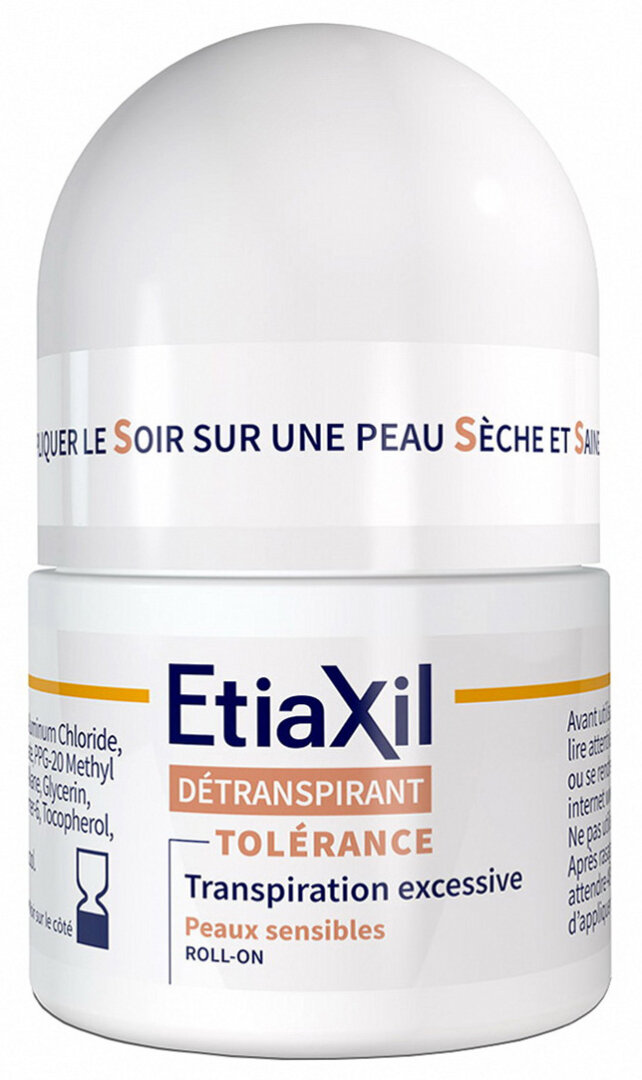 Etiaxil Tolerance - ефективний роликовий антиперспірант нічної дії для чутливої шкіри, який забезпечує тривалий захист від помірного потовиділення і запаху поту в області пахв. Засіб підходить також і людям з нормальним типом шкіри. Не містить спирт. Надає на шкіру більш м'який вплив завдяки новій системі догляду за шкірою. Збагачений натуральними пом'якшуючими речовинами для максимального комфорту самої чутливої шкіри. Одне нанесення на ніч забезпечує захист від поту і запаху до 3 днів, антиперспірант зберігає свій ефект незалежно від щоденних водних процедур. Користуватися Etiaxil Tolerance досить 1 або 2 рази на тиждень або рідше, в залежності від ступеня вираженості потовиділення. Одного флакона вистачає на 4-6 місяців.