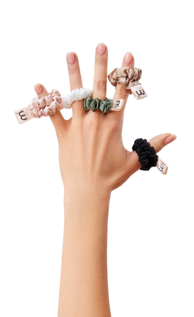 Уменьшенный формат резинок из натурального 100% шелка трендового цвета воплощает практичность и минимализм, бережно фиксирует тонкие волосы в 2 оборота, минимизируя их повреждение и ломкость.