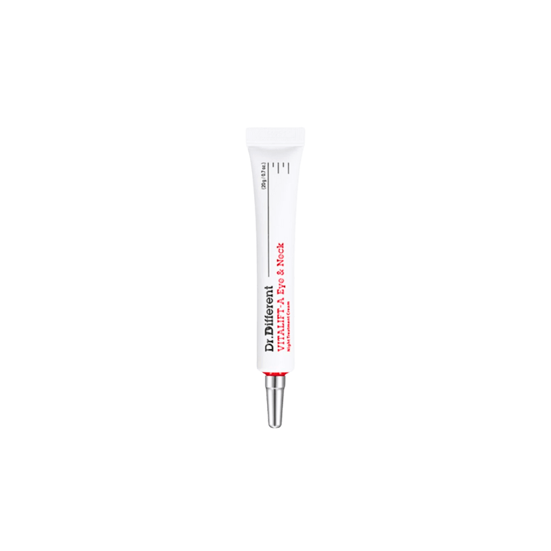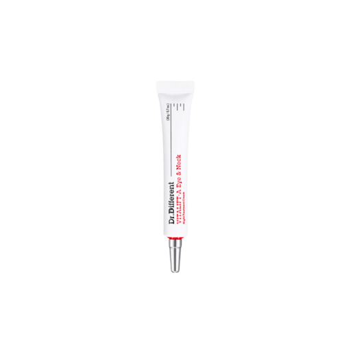 Dr.Different VITALIFT-A Eye & Neck - крем для шкіри навколо очей з ретиналем 0.025%. Спеціальний лікувальний крем для інтенсивного догляду за ніжною зоною навколо очей і зморшками на шиї. Він містить найкращий інгредієнт проти старіння – 0,025% ретиналю та 11 різних типів пептидів для зменшення зморшок і вирівнювання тону шкіри. Діє проти перших ознак старіння. Підходить для всіх типів шкіри.