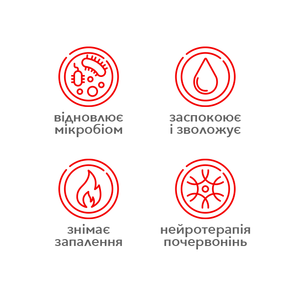 - Пребіотик BioEcolia® і пробіотичні молочнокислі бактерії нормалізують мікробіом шкіри, відновлюючи нормальну чутливість.